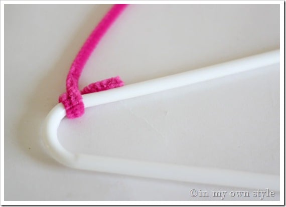 1. To start wrapping the pipe cleaner on the hanger – bend and fold the tip over on one pipe cleaner about 1-inch. Place on top of the end of one shoulder section of the hanger.