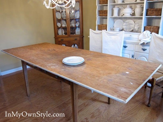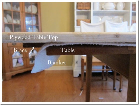 Take Note: See the vertical pieces of wood on the underside of the plywood table extension? The space between them is the actual length of my dining room table.