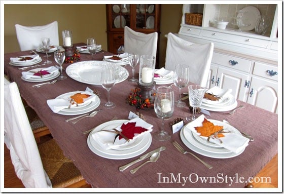 My dining room table and chairs were handed down to me from my parents. The table doesn’t have center leaves to extend it, so my dad made a plywood top that comes out every Thanksgiving and stays up until Christmas.
