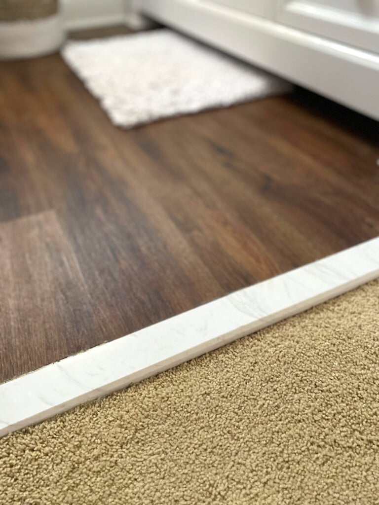 In one of the bathrooms – we used the existing marble threshold between the NuCore and the carpet in the hallway that connects to the room. I did run a thin line of white caulk where the planks meet the threshold to make it look finished.