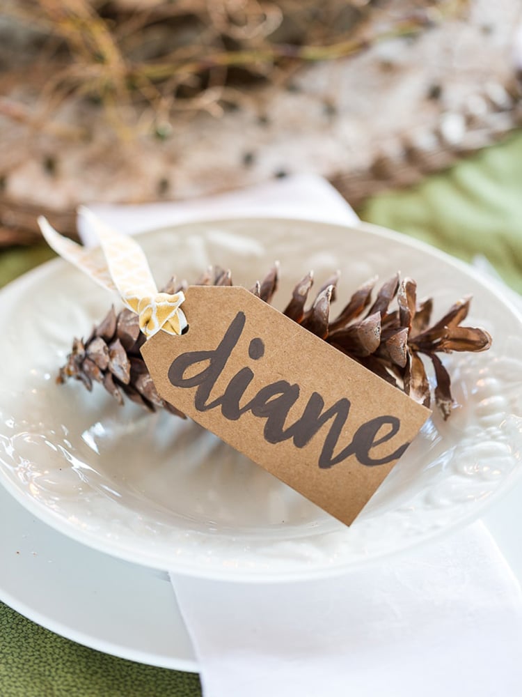 Purchase a pack of pre-made gift tag in the paper aisle at the craft store to make these Gift Tag Table Place Cards. Print or handwrite the names of your guests on each tag and tie then onto a pinecone and place on or near the dinner plate.